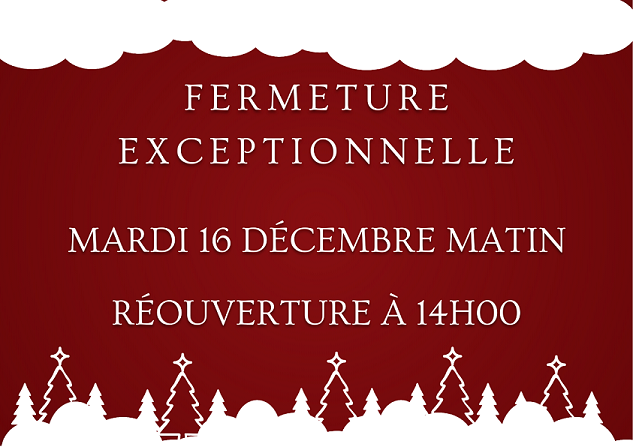 Attention, votre médiathèque sera exceptionnellement fermée durant la matinée du mardi 16 décembre 2025.
